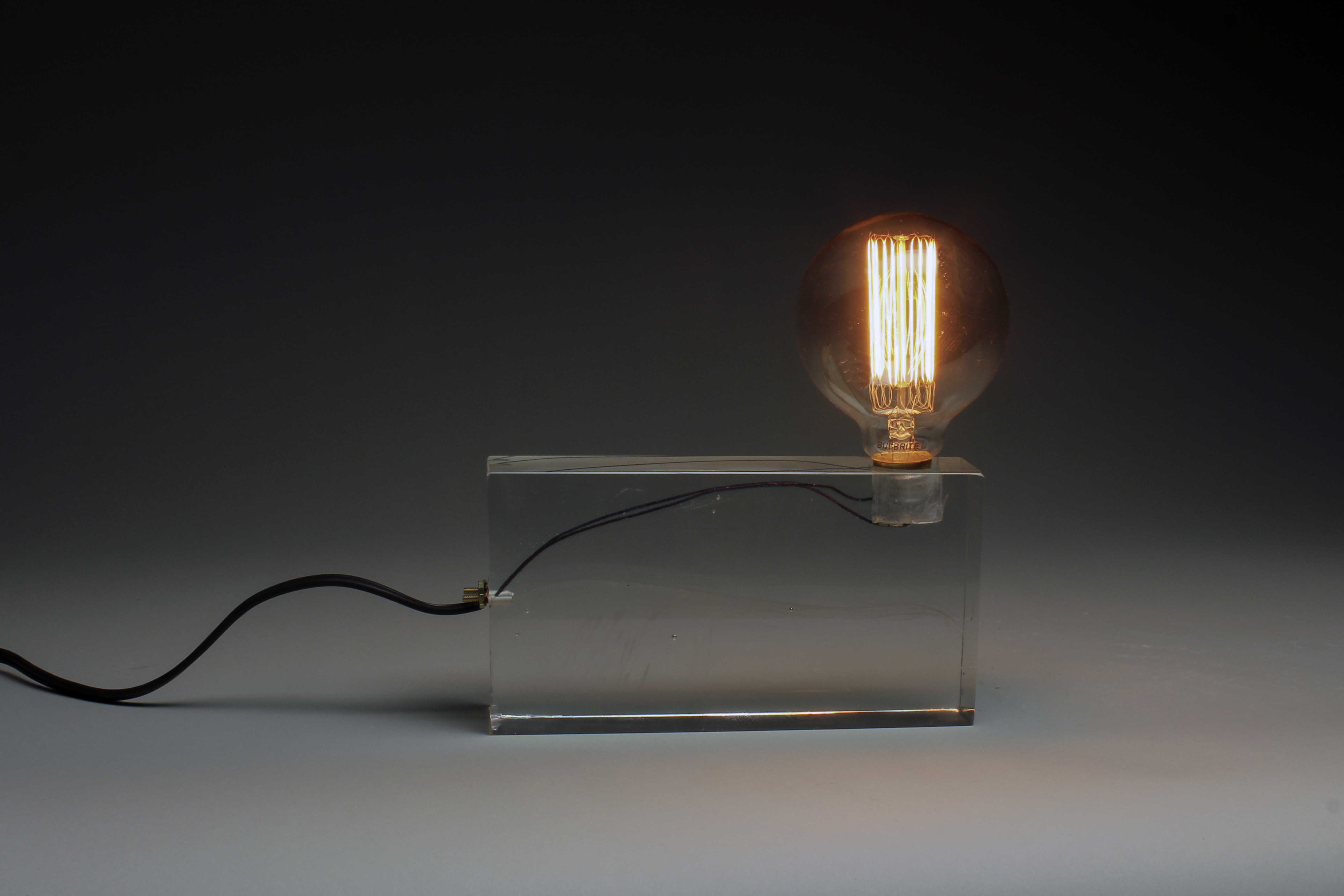 Kiln-cast, cold-worked glass, copper wire, light bulb, electrical components.