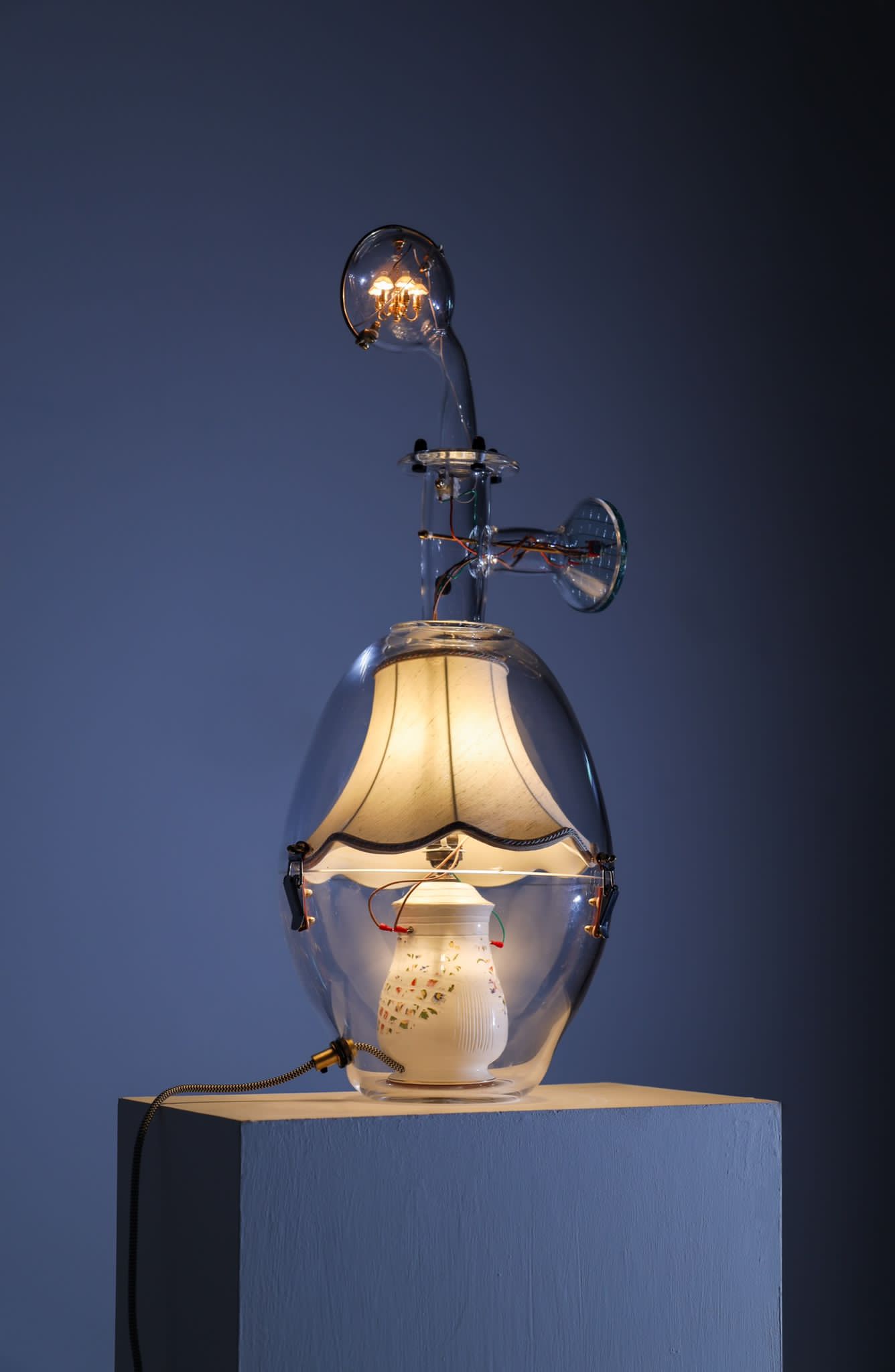 Blown, cold-worked glass, found lamp, 1/12 scale chandelier, electrical components, mixed media.